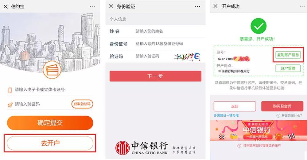 第三步、如果您没有中信银行借记卡或账户(如有,请直接进入第四步),您可以点击【去开户】,提交姓名、身份证号、他行借记卡卡号等简单信息,在线开立中信银行电子账户。复制账户信息后返回卡号绑定页面。