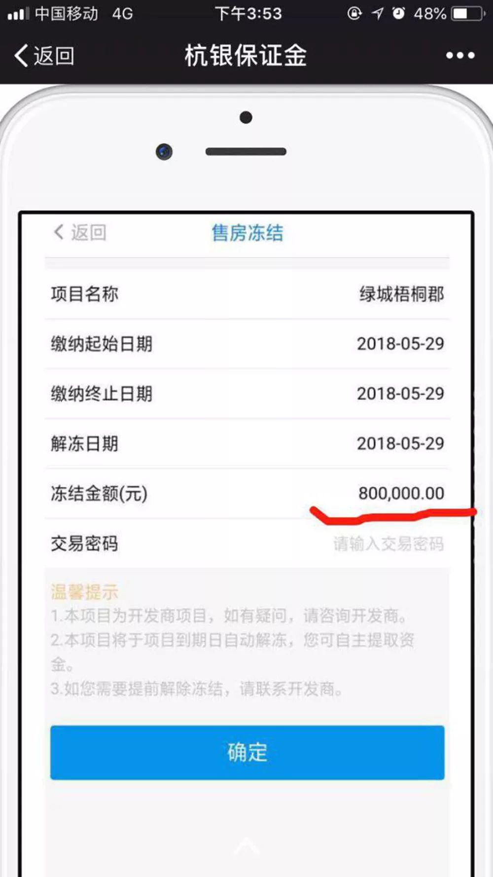 2、充值成功后,点击“首页”中“生活缴费”选择“杭银保证金”——“售房项目冻结”中选中“本次摇号项目名称”确定,输入冻结金额,输入交易密码后点击确认,该交易可通过“售房项目明细查询”查看结果。