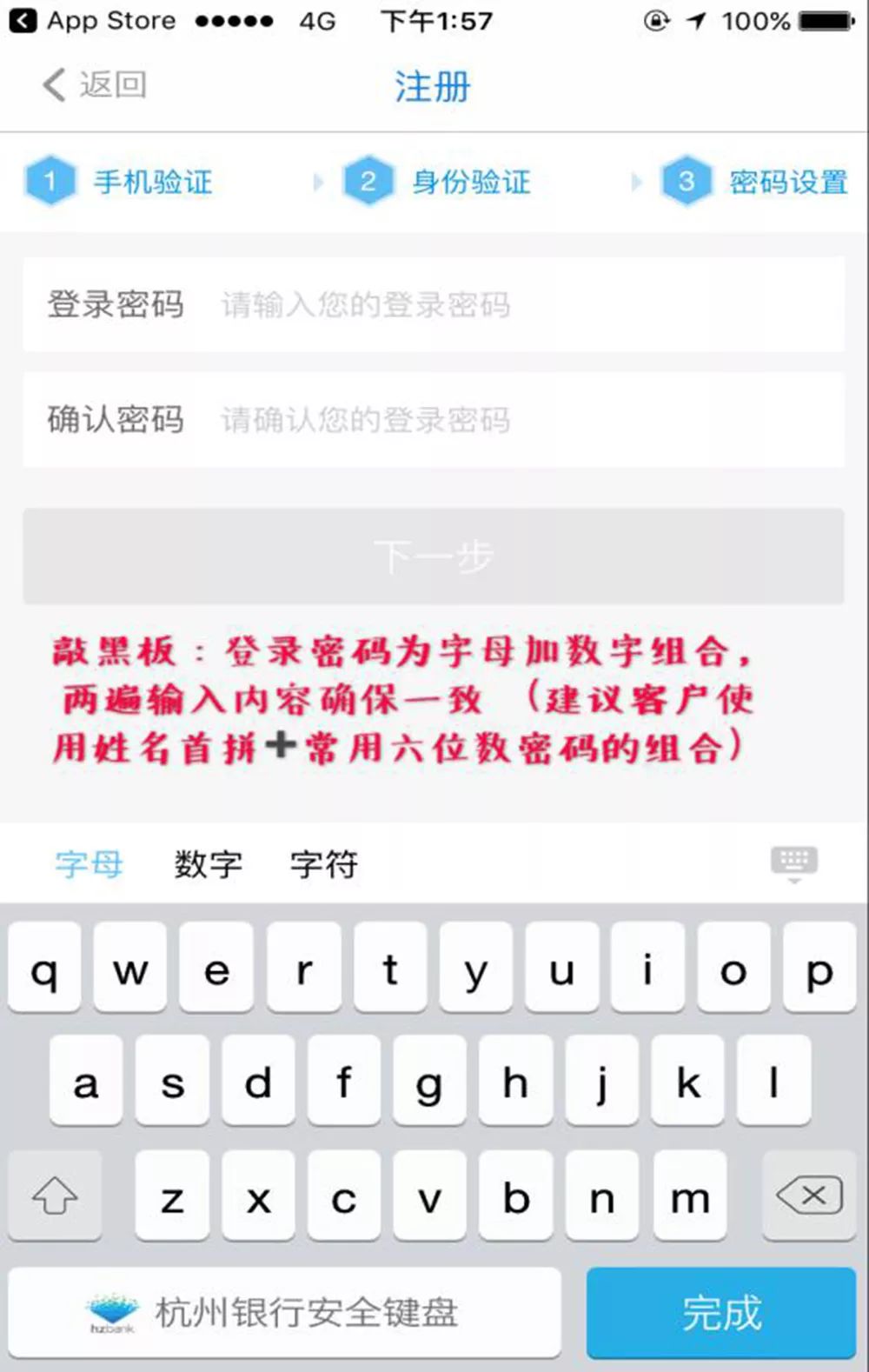 6、设置登录密码(字母+数字的组合,务必牢记!!确保两次输入一致,点击下一步设置交易密码。交易密码为六位数常用密码,需输入两次,确保输入一致!