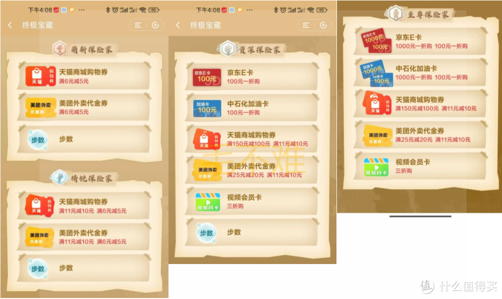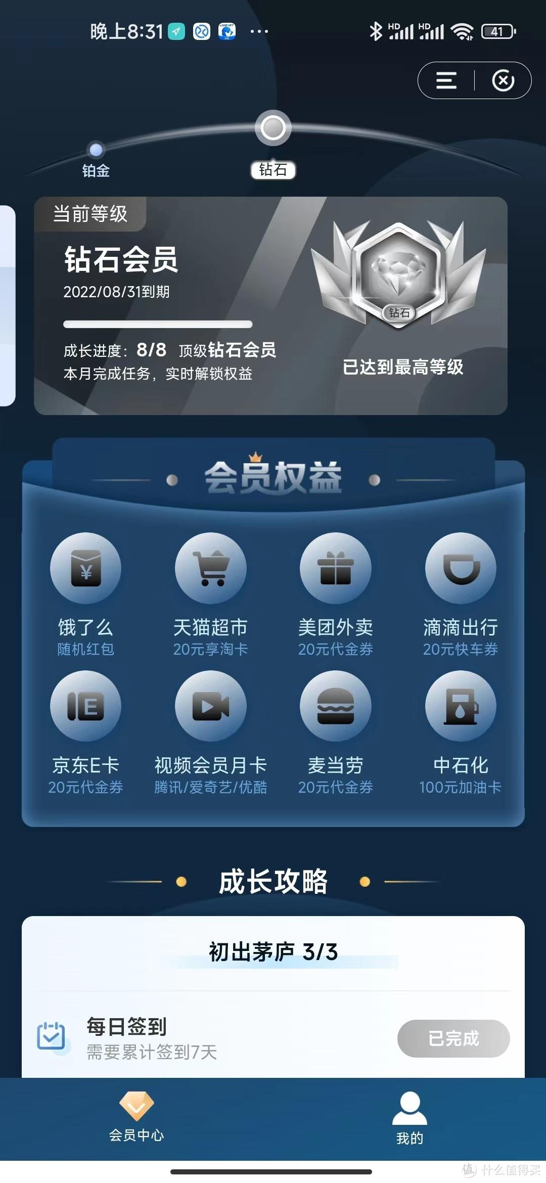 规则: 会员等级共分了7级,达到钻石级别后可领中石化100元加油卡、30元天猫超市享淘卡、20元京东E卡、美团外卖20元代金券、滴滴20元快车券、麦当劳20元代金券及腾讯/爱奇艺/优酷视频会员月卡任选其一,升级其他的只需要完成任务就可以了,基本上就是签到和点点页面,特别说一下购买理财的任务需要在交易时间内购买,为无风险套利购买基金一般选择短债类基金,购买理财选择货币基金类理财产品。