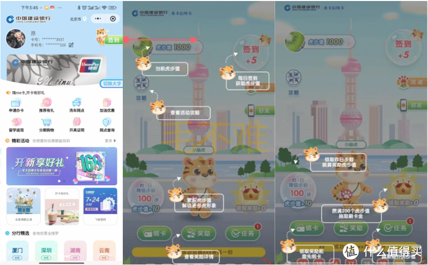 规则:通过每日签到,收集步数(前一日每满1,000步对应1个虎步值),好友互动,完成每日任务等方式获取虎步值,虎步值每满200步即可抽奖1次,0.18-888元刷卡奖励金,完成整个规定路线还有机会抽大奖。。。