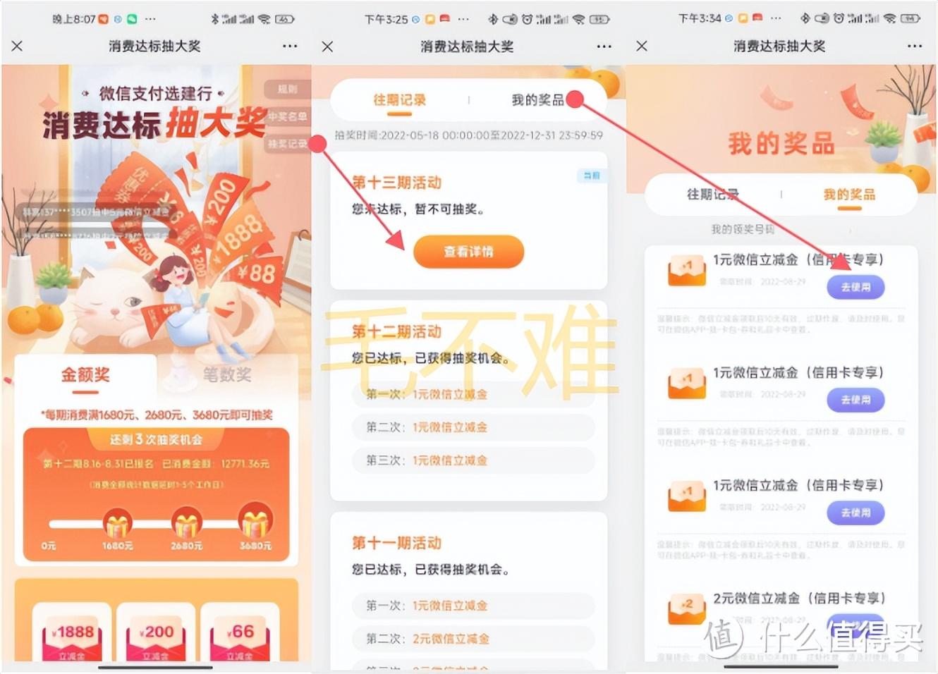 规则:报名客户在消费统计期内,使用微信支付绑定建行卡(借记卡或信用卡)进行消费,达标后可自主选择参与金额奖或者笔数奖抽奖(注:活动期间,金额奖与笔数奖每位客户只可参与其一,确认活动抽奖方式后不可改)。活动时间一般是每半个月1个周期,即使忘记抽奖也不怕,可以在活动页面“抽奖记录”领取往期奖励。