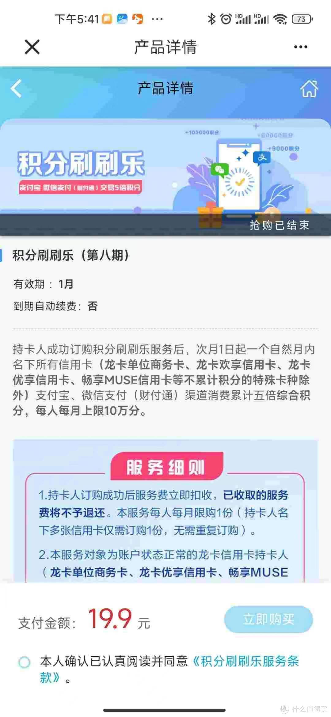 规则:19.9元购买服务包后,次月1日起1个自然月内(2022年9月1日-9月30日),通过支付宝/微信渠道消费获得5倍综合积分(次日入账),每月上限10万积分,实际到账是支付宝5倍/微信6倍,因为微信有赠送1倍积分的活动(每月上限1万分)。
