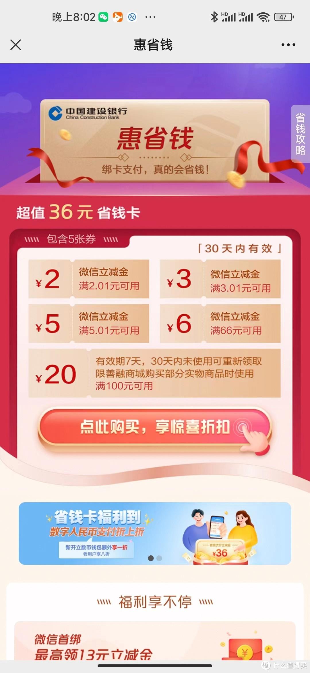 规则:进入“惠省钱”活动页面抽取购买价格并成功支付页面显示的费用后,即可获得对应优惠券包。每张省钱卡包含5张总价值为36元的微信支付立减金,面额分别是2元、3元、5元、6元(满66元使用)、20元(满100元使用)。