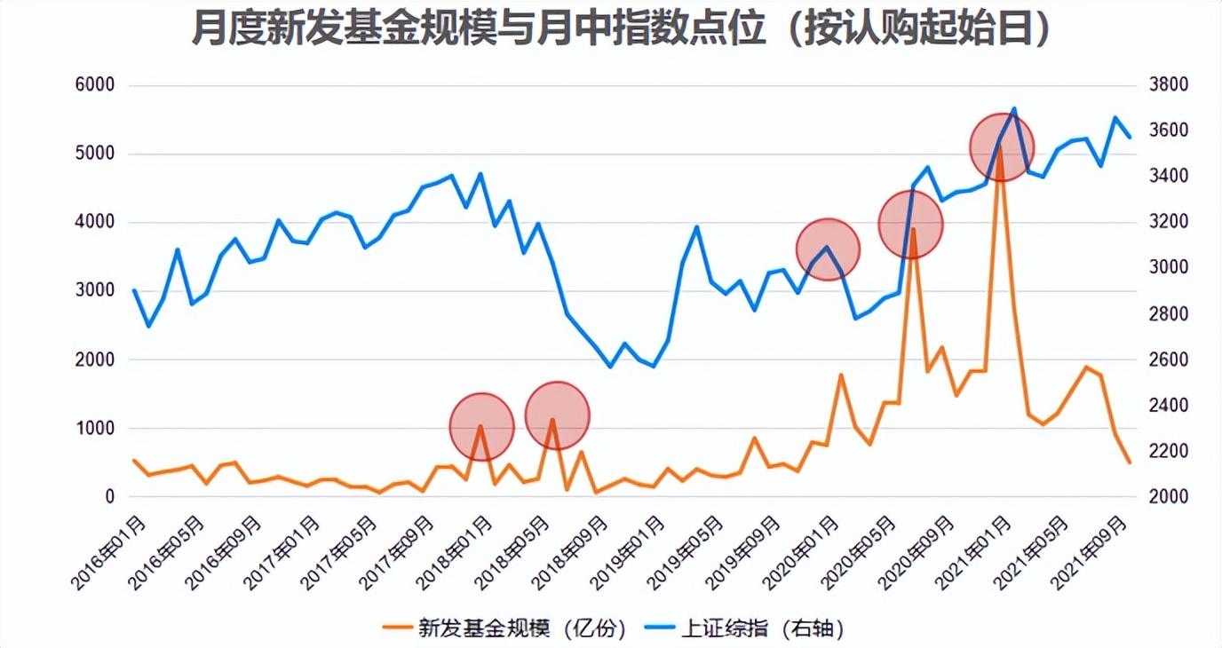 还是来看这张基金新发和指数的走势图,可以看到,在几个发行量激增的时点,比如18年1月份、20年2月份和7月份,都是市场的阶段高点。所以,根据基金发行来判断市场卖点还是比较靠谱的。