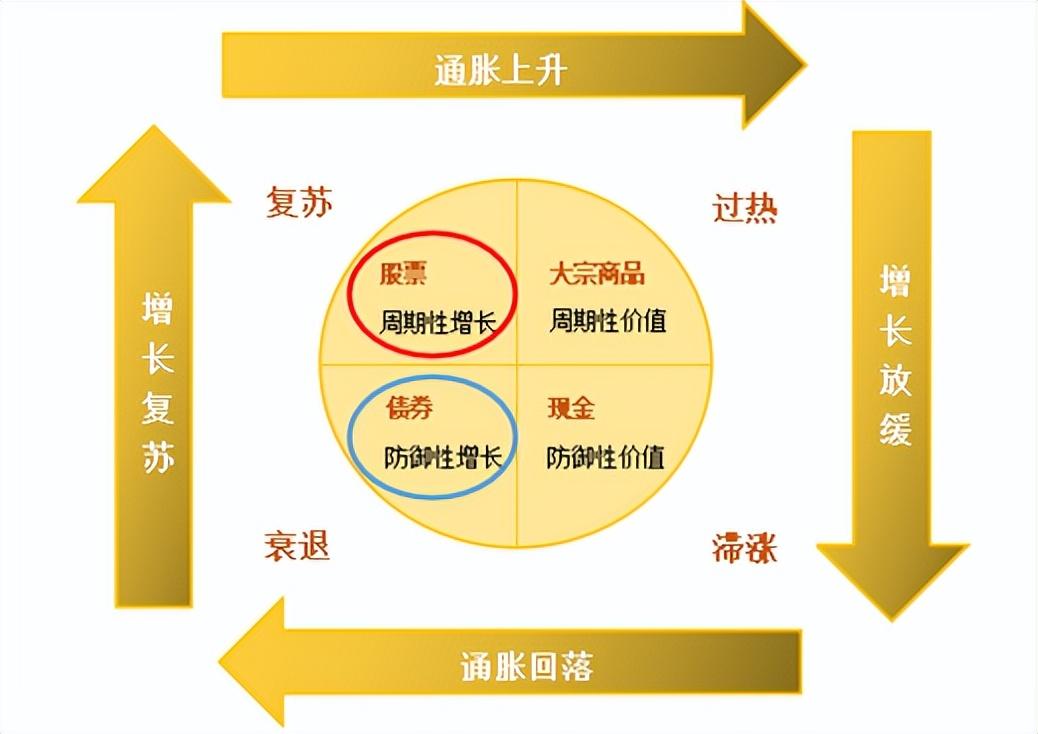 比如,在复苏期,经济增长复苏,同时通胀较低,这个时候是股票投资的黄金时期,债券次之、现金贬值、商品低迷。此时应多配置偏股类基金,享受经济复苏带来的市场红利。