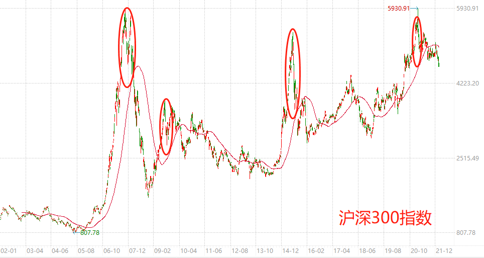 如图中展示的是沪深300指数和250日均线的关系,从历史数据来看,当偏离度大于50%、60%时,就到了牛市中后段,该止盈了。但注意的是,250日均线属于牛熊线,适合长周期级别的投资。如果只是较短周期的投资,想捕捉住止盈的机会,偏离度就不能太大,比如2018年初和2021年初。