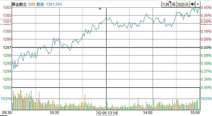 今日黄金概念板块指数小幅低开,随后震荡上行,呈现上涨走势。截止收市,指数整体上涨0.43%。