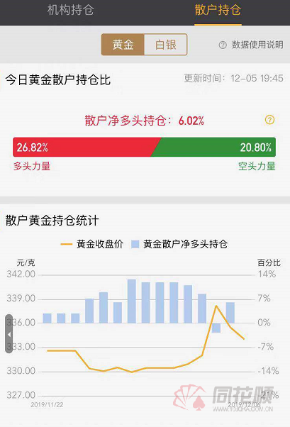 散户持仓数据上,黄金散户净多头持仓为6.02%。其中,多头力量为26.82%,空头力量为20.80%,说明目前散户多空持仓相对均衡。