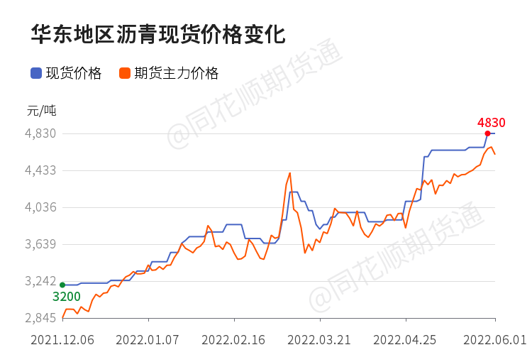 6月2日华东地区沥青现货价格报价4830.00元/吨,相较于期货主力价格(4637.00元/吨)升水193.00元/吨。