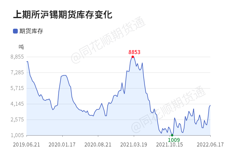 6月17日沪锡期货库存录得4022.00吨,较上一交易日增加214.00吨。
