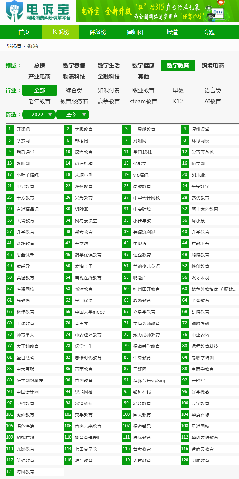 据国内知名网络消费纠纷调解平台“电诉宝”(315.100EC.CN)显示,2022年至今,“电诉宝”受理投诉中涉及的在线教育平台按投诉量依次为开课吧、大鹏教育、一只船教育、潭州课堂、学慧网、帮考网、对啊网、腾讯课堂、深海教育、掌门1对1、常青藤爸爸、聚师网、尚德机构、亿起学、嗨学网、小叶子陪练、大塘小鱼、 vip陪练、51Talk、中公教育、潭州教育、高顿教育、平安好学、十方教育、兴为教育、中华会计网校、赛优教育、有道精品课、VIPKID、中安建培、阿卡索外教网、天普教育、网易云课堂、小步早教、河小象、升学教育、帮考教育、英语流利说、升学教育、众趣教育、开学啦、中职通、有教不舍、思鑫诚禾、简学优课教育、恒企教育、鸿博教育、猿辅导、麦淘亲子、兰迪少儿英语、峰创教育、美通教育、鹰视在线教育、鸭题库、聚才木羽、库课网校、新沐教育、神州国开教育、鲸鱼外教培优、高教通、掌门优课、鼎颜教育、金智教育、极佳教育、中国大学、立身学教育、研博教育、千课教育、壹点零、学高为师教育、神啦考研师、中安建培教育、聚力成师教育、中企安培、大正坤教育、亿学牛牛、儒道爱学教育、远程教育科技、盛世慧智、思维时代教育、佰异教育、易职学培训、中大互联、青雨教育、三好网、卓而学教育、研学网络科技、青创教育、海豚音乐vipSing、云舒写、中国会计网、思鸿网校、铭科在线、好学微客、空格教育、尔湾科技、轻轻教育、芸学教育、虎硕教育、英孚教育、国大教育、华夏杏坛、深色海浪、育尚未来教育、儒道智果、早道网校、加盐在线、抖音查理老师、辰际教育、华创安培教育、九洲教育、七田真早教、普考教育、睿尚云教育、笑蛙教育、沪江教育、天软教育、明辰教育、海风教育等。