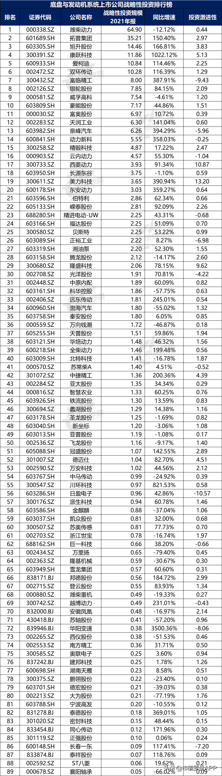 图17:底盘与发动机系统上市公司战略性投资排行榜