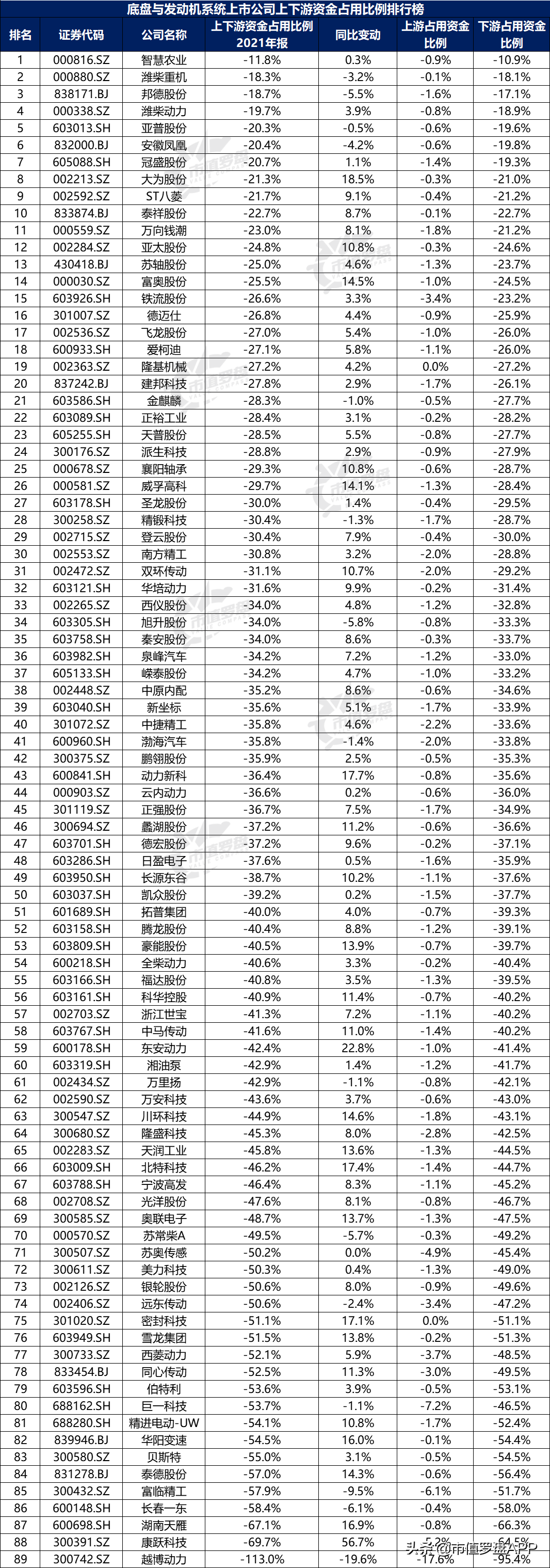 2021年89家底盘与发动机系统上市公司全部被上下游占用资金。榜单前三发生改变,智慧农业(-11.8%)第一,潍柴重机(-18.3%)第二,邦德股份(-18.7%)第三。较去年同期,73家公司对上下游议价能力增强,16家公司对上下游议价能力减弱。