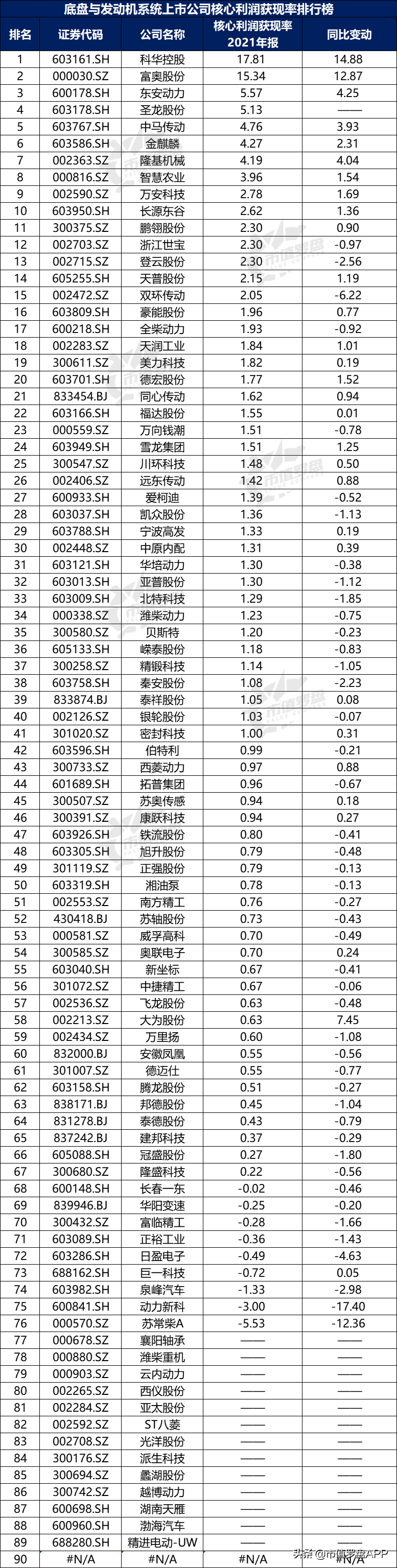 其中,仅有1家企业净利润规模突破100亿元,11家企业亏损。榜单前三未发生改变。2021年净利润第一名是潍柴动力(115.62亿元),第二名是威孚高科(26.49亿元),第三名是拓普集团(10.18亿元)。