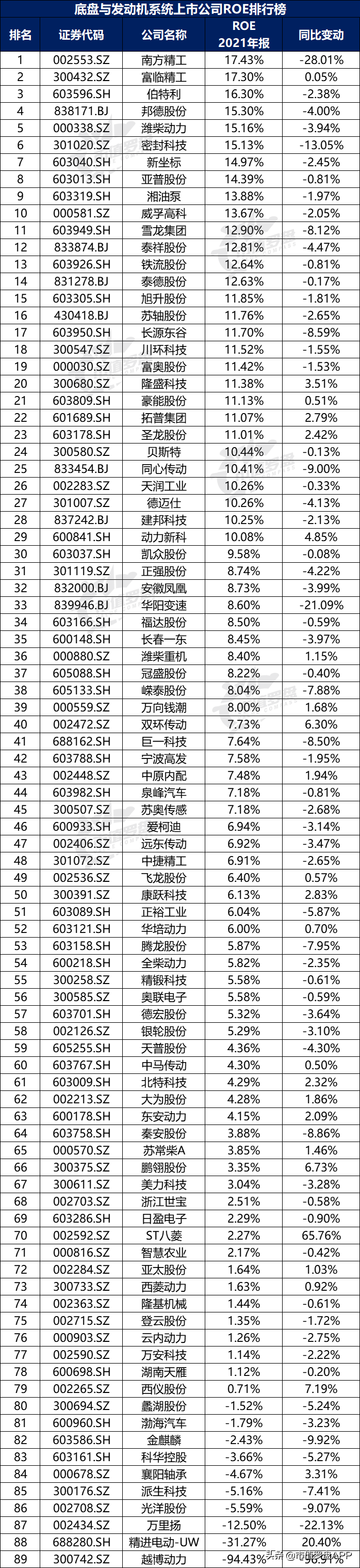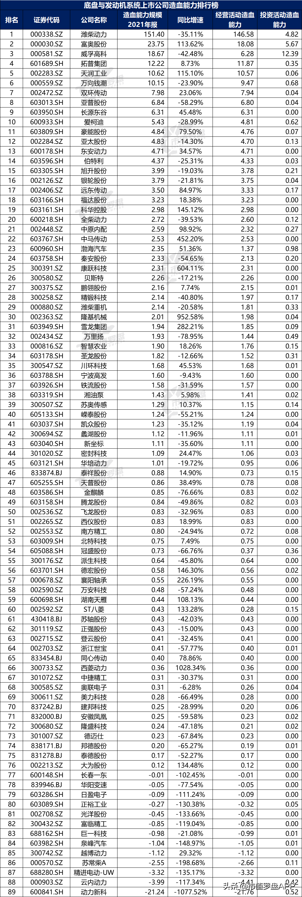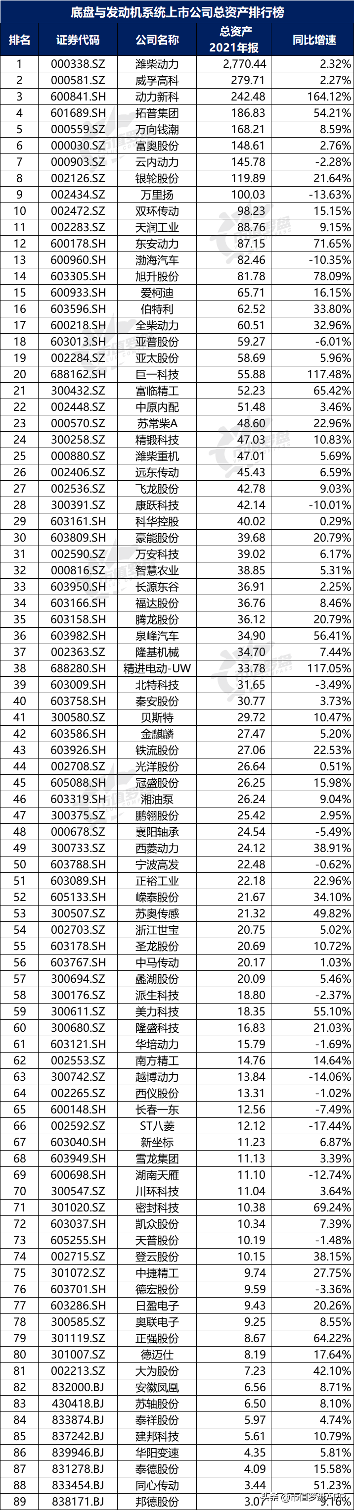 其中,仅有1家总资产规模超过1000亿。榜单前两名没有发生改变,第一名是潍柴动力(2770.44亿元),第二名是威孚高科(279.71亿元),动力新科(242.48亿元)代替万向钱潮排名第三。