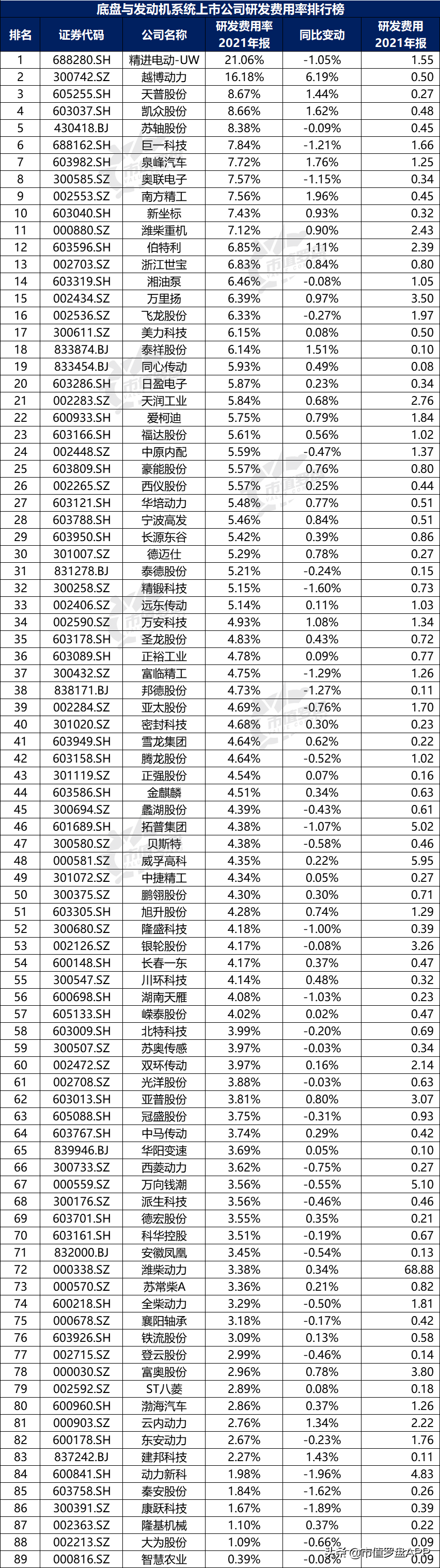 2021年底盘与发动机系统上市公司研发费用规模前三为潍柴动力(68.88亿元)、威孚高科(5.95亿元)、万向钱潮(5.10亿元)。研发费用率前三为精进电动-UW(21.06%)、越博动力(16.18%)、天普股份(8.67%)。