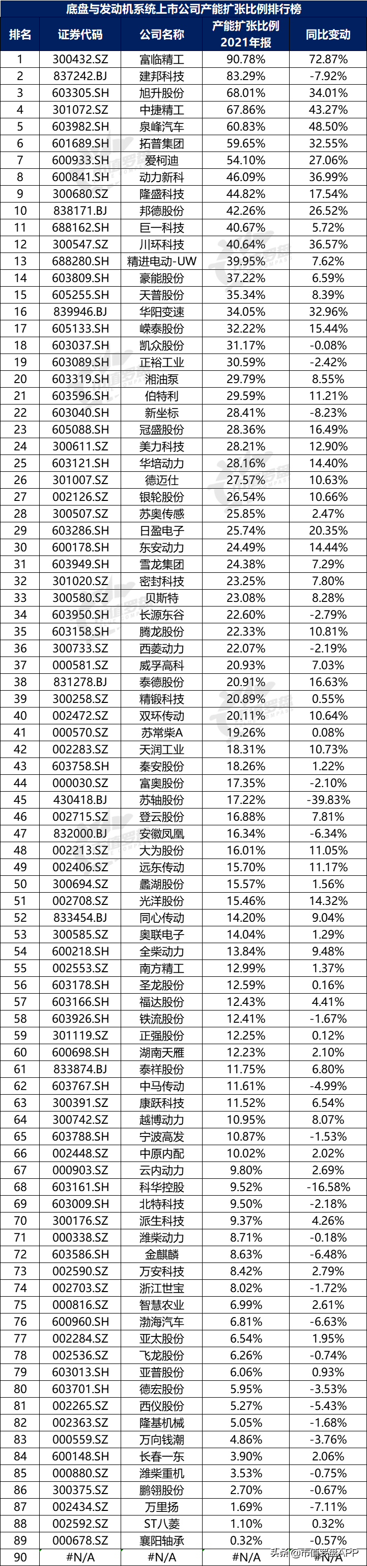 2021年没有底盘与发动机系统上市公司产能扩展比例超过100%,榜单前三发生改变,富临精工(90.78%)代替建邦科技排名第一,建邦科技(83.29%)退居第二,旭升股份(68.01%)代替新坐标排名第三。