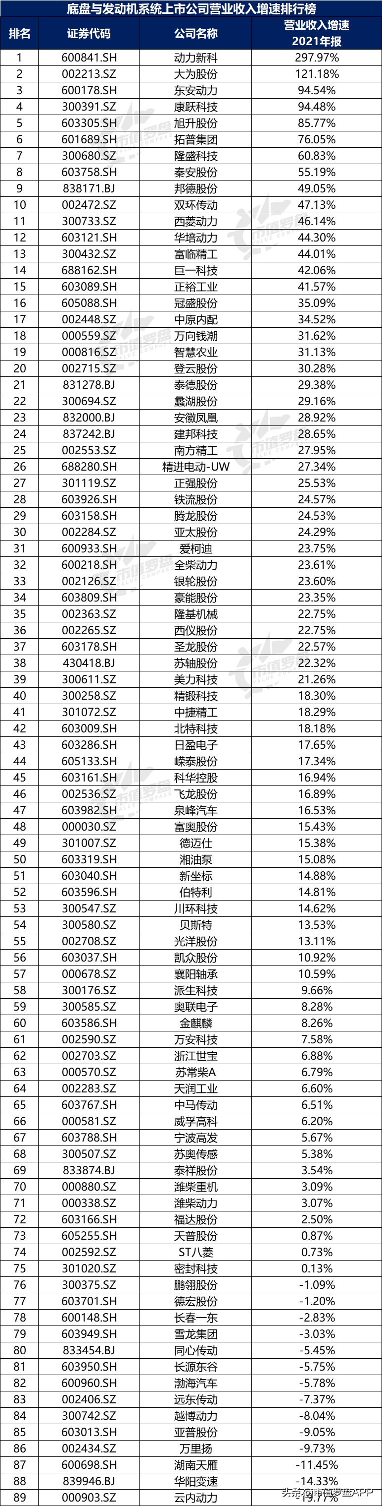 此外,38家底盘与发动机系统上市公司净利润实现增长,38家净利润下滑,11家亏损,其中12家企业实现了50%以上的高速增长,7家企业增幅更是超过100%。