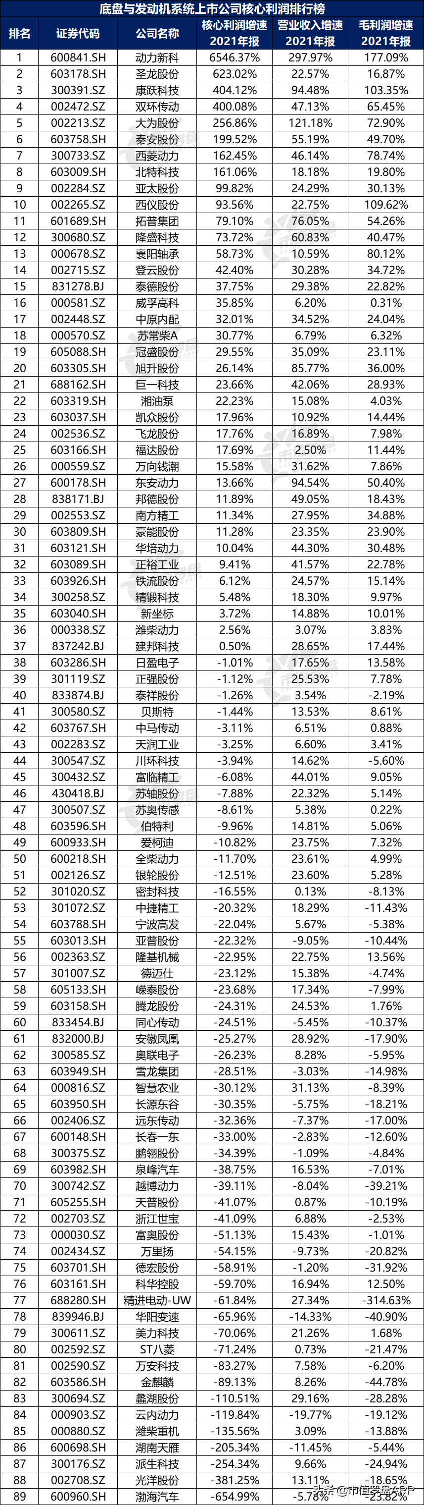 2021年33家底盘与发动机系统上市公司核心利润增长,42家核心利润出现下滑,6家核心利润下滑至亏损,3家核心利润亏损扩大,4家核心利润亏损缩小但任未能扭亏。