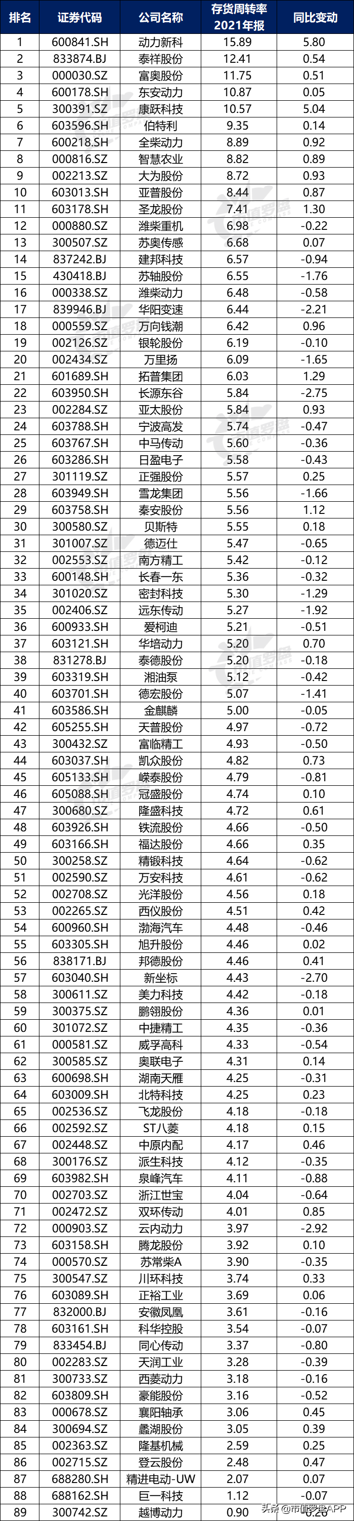 2021年有5家底盘与发动机系统上市公司总资产周转率超过1,榜单前三发生改变,动力新科(1.46)代替亚普股份排名第一,大为股份(1.39)代替全柴动力排名第二,亚普股份(1.32)退居第三。较去年同期,54家公司资产利用效率提高,35家公司资产利用效率降低。