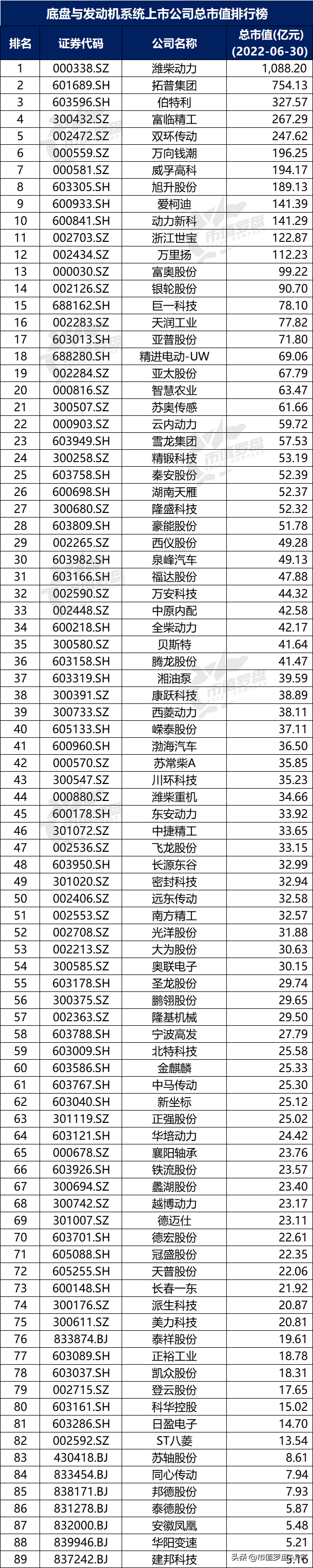 2022年6月30日,底盘与发动机系统上市公司共有89家,总市值为6499亿元。主要为20~50亿规模的小市值企业,共计47家,占比53%,超过50亿的有28家,占到行业总数的31%,超过1000亿的仅有1家。