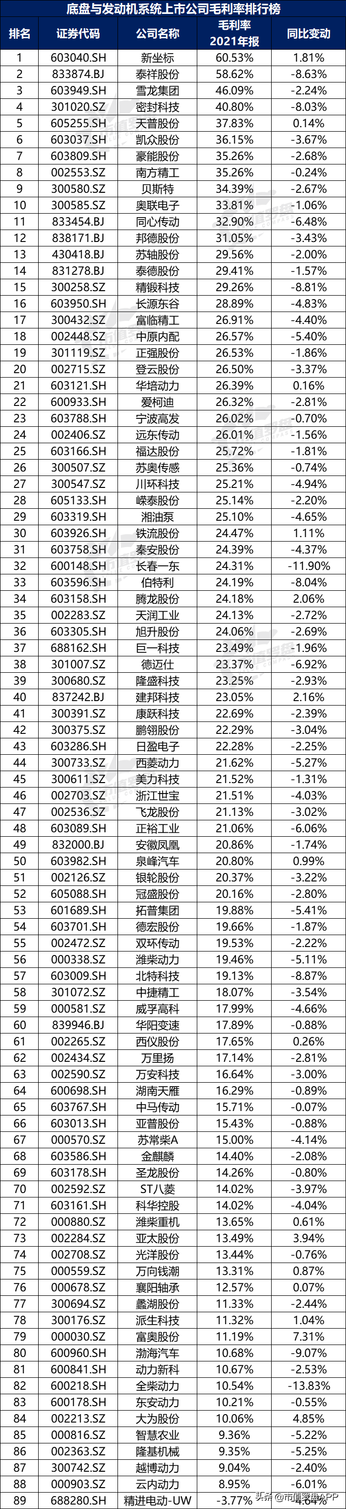 2021年底盘与发动机系统上市公司53家实现毛利润增长,35家毛利润出现下滑,底盘与发动机系统多数上市公司产品盈利改善。