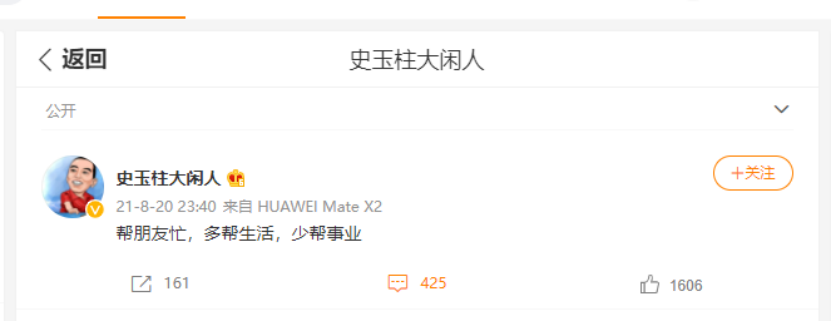 值得一提的是,同一时间,史玉柱在微博上也进行了隐秘性的回应称“帮朋友忙,多帮生活,少帮事业”,暗指他帮助朋友事业被担保拖累。
